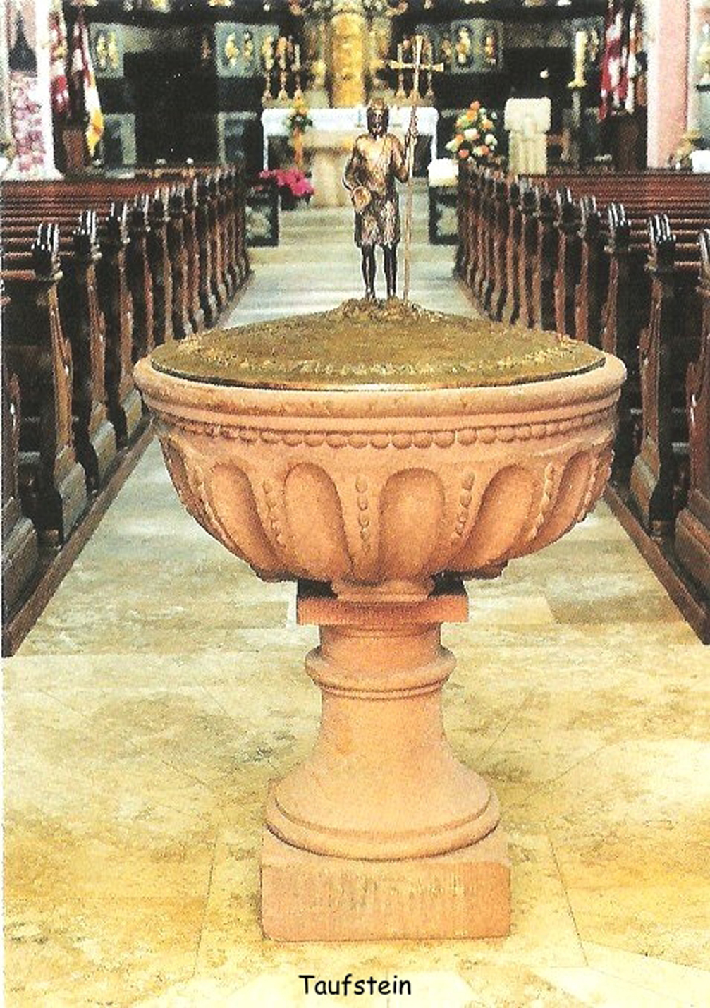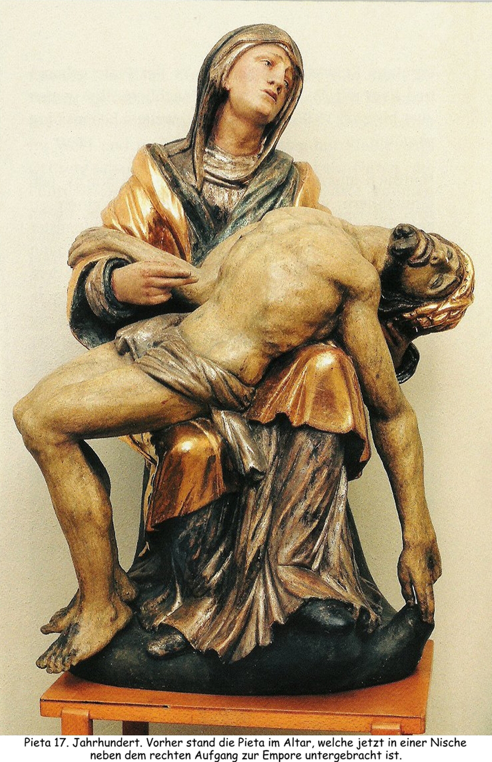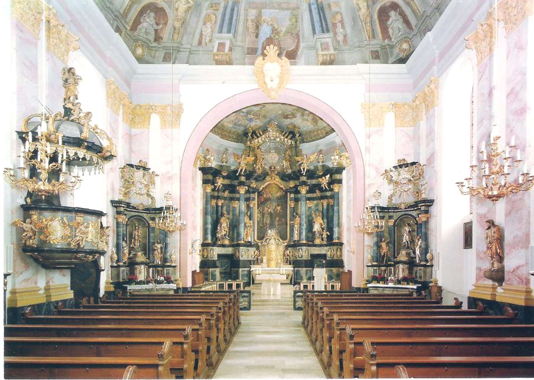 Zwischen den Säulen steht links der Hl. Rochus und rechts der Hl. Nepomuk. Beide Holzfiguren schnitzte der Miltenberger Bildhauer Nagel. Die Kommunionbank trennt den Chor vom Langhaus. 1968 wurde sie einen Meter vorgesetzt, um mehr Platz im Chorraum zu haben. Von den Bänken im Langhaus sind die Wangen noch im Original erhalten, sonst sind die Bänke den heutigen Bedürfnissen der Kirchenbesucher angepasst: 36 x 6 Personen = 216 Plätze im Langhaus Seitenaltäre Die Seitenaltäre wurden 30 Jahre nach der Weihe der Kirche aufgestellt. Geliefert hat sie der Aschaffenburger Bildhauer Ernst Hofmann. Die Darstellung am Marienaltar ist eine 90 x 50 x 40 cm große Tragfigur, die man bei Prozessionen mitführte. Sie kam erst 1899 in die Nische. Vorher stand die Pieta im Altar, die jetzt in einer Nische neben dem rechten Aufgang zur Empore ihren Platz gefunden hat. Diese Holzfigur in Lebensgröße stammt aus dem 17. Jahrhundert.