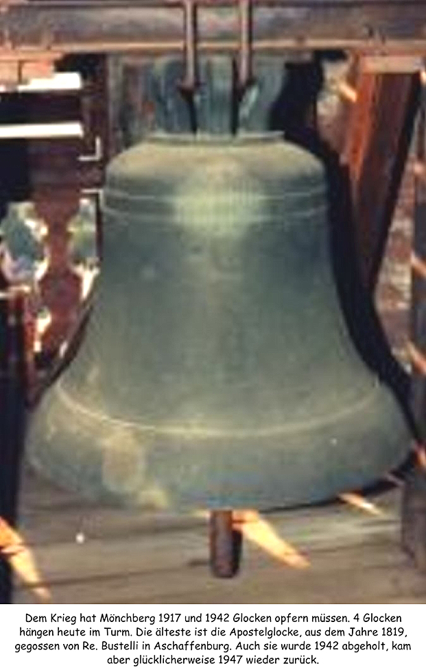 4 Glocken hängen heute im Turm. Die älteste ist die Apostelglocke, aus dem Jahre 1819, gegossen von Re. Bustelli in Aschaffenburg. Auch sie wurde 1942 abgeholt, kam aber glücklicherweise 1947 wieder zurück. Der Turm: Höhe 49 Meter Wandstärke des Sockels: 170 cm Anzahl der Glocken: 4 Josefsglocke (unten links, 400 kg) Marienglocke (unten rechts, 560 kg) Apostelglocke (oben links, 630 kg) Johannisglocke (oben rechts, 400 kg) Überstanden hat den letzten Krieg die Josefsglocke, das Taufglöcklein. Sie wurde 1926 von der Firma Klaus, Heidingsfeld, gegossen. Aus dem Gemeindeleben