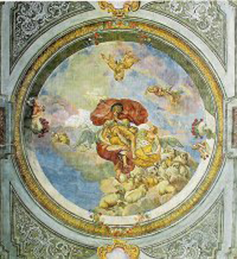 Beim Blick zur Decke fällt dem Beschauer zunächst die Muschelkartusche mit dem Namenszug