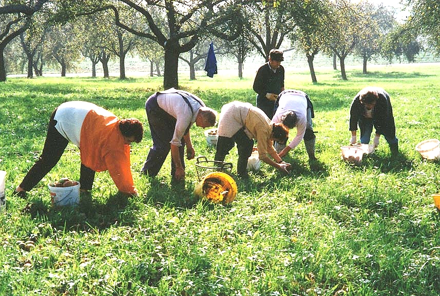 Die Appelsammler: Durch den Verkauf gesammelter Äpfel, die Mönchberger Bürger zu Verfügung stellen, wird mit dieser Apfelsammelaktion die Kirche finanziell unterstützt.