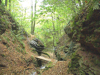 Klingenberger Schlucht: Von Mönchberg über Ortsteil Schmachtenberg in Richtung Klingenberg Tonbergwerk in den Pfad-Einstieg zur Schlucht (4 km).