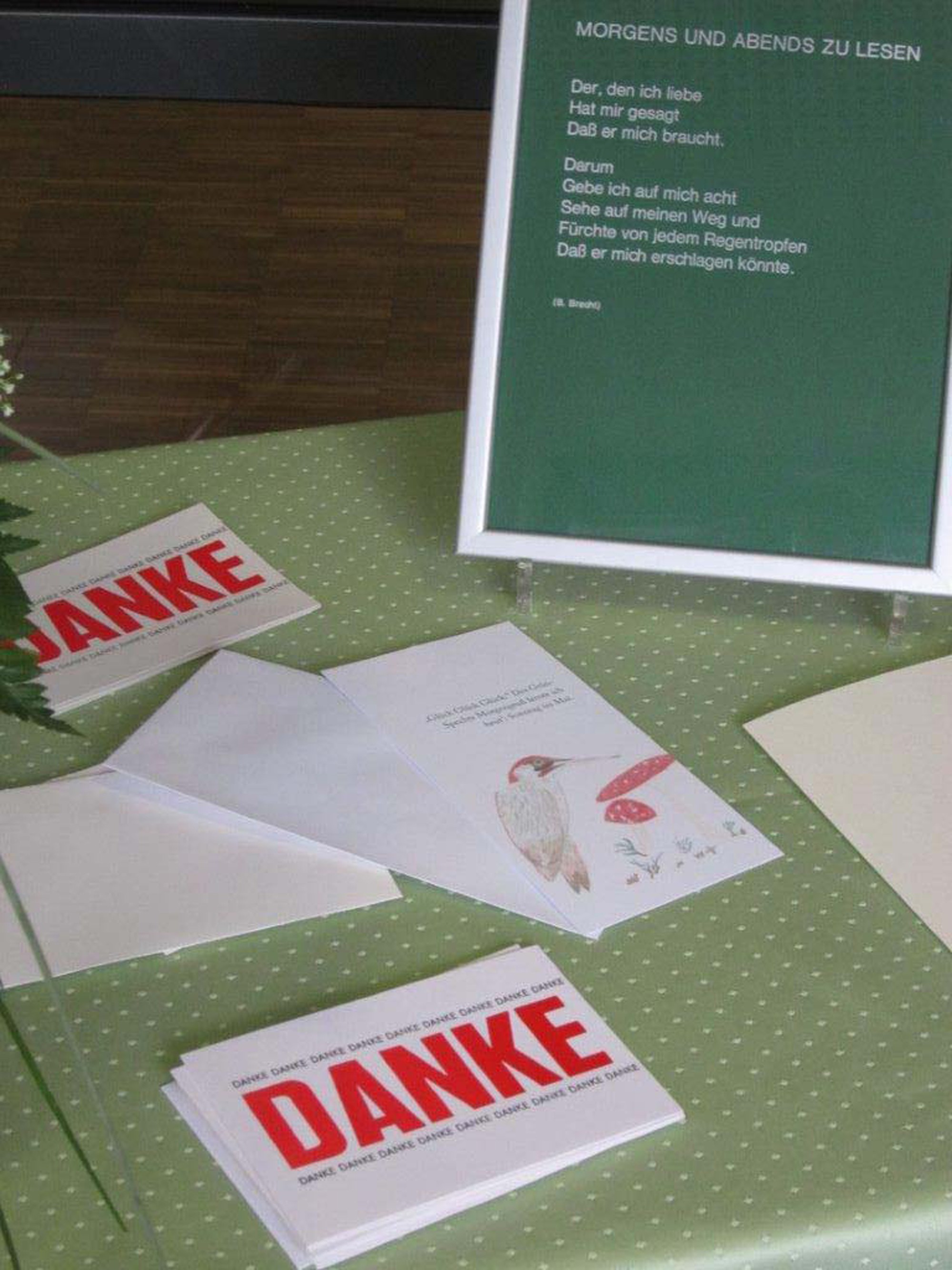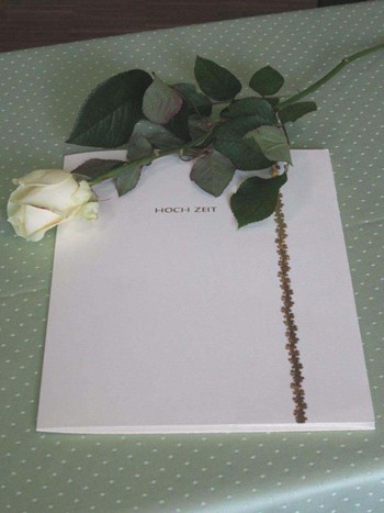 Bei der Auswahl der Schrift galt das Hauptaugenmerk , das sie mit dem Inhalt des Gedichts korrespondiere wie überhaupt die Komponenten der Mappe in harmonischer Verbindung zueinander stehen. Das tschechische Bütten-Papier (120gr /qm) trägt eine feine, leinartige Filzmarkierung und ist wie die Mappe und auch das Band zart champagnerfarben. Lediglich das Frontispiz HOCH ZEIT und der Stern sind in Gold. Ein exclusives Hochzeits-Geschenk von zeitloser Dauer, das dem ästhetisch empfindenden Menschen große Freude bereitet und wann, wenn nicht zur HOCH ZEIT zeigt sich unser Auge empfänglich für Schönheit. Die Auflage ist auf 33 Exemplare limitiert und signiert. Wahlweise auch rotes Band mit leiser Goldeinfassung und Schlaufe. Im selben Verfahren hergestellt, die zweifarbigen DANKES-KARTEN im edlen Umschlag. Oder aber ein Text voll tiefer Poesie, den Braut und Bräutigam - Menschen die das Band der Liebe einigt - tatsächlich jeden Tag lesen sollten, damit dieser sie schirme. Der Text ist in silbernen Lettern in Futura (einer Bauhaus-Schrift) gesetzt. Auf tanngrünem oder karminrotem Papier , das leuchtet scharlach , wenn die Sonne darauf scheint. Feinsilber Holzrahmen von Atelier gerahmt ! Das Handdruckverfahren ohne moderne Maschinen ermöglicht es, kleine Mengen exklusiv nach Ihren Wünschen herzustellen. Selbstverständlich fertige ich unter Berücksichtigung Ihrer individuellen Vorstellungen, Erinnerungs- , Einladungs- , Menü- und Dankes- Karten , zum Fest der Feste und zu anderen Anlässen.