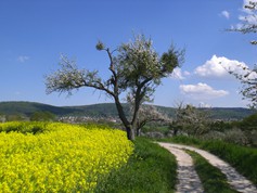 Einer der reizvollsten Wege führt rund um Mönchberg bis zum Ortsteil Schmachtenberg, jeweils mit Blick auf den Kirchturm der schönen Barockkirche St. Johannes der Täufer. Zur Rast bietet sich hier das Landgasthaus "Zur Sonne" mit eigener Traditionsmetzgerei und Schlachtung. Dort bekommt man einen reichhaltigen Spessart-Vesperteller mit Hausmacher Wurst, Käse und dazu, der aus Äpfeln der eigenen Streuobstwiesen, selbstgekelterte Apfelwein. Aber es gibt noch viele andere reizvolle Wander- und Ausflugsziele wie z.B. der Landgasthof "Waldfrieden" in Wildensee. Und essen kann man in allen Gasthöfen dieser Region gut. Zum Beispiel einen saftigen Schweinebraten mit hausgemachten Knödeln oder frische Forellen aus den Spessartbächen. Eine Spezialität dieser Gegend sind aber Wildgerichte. Dazu trinkt man natürlich Frankenwein. Hier im Mainviereck wachsen ja einige hervorragende Lagen wie der Großheubacher Bischofsberg, der Klingenberger Spätburgunder und der Erlenbacher Sonnenhügel. Aufsteigen und Rad fahren, die Fahrt und die einmalige Ausstrahlung der Spessartpfade und Landschaft genießen und sich erholen. Auf gehts! Anschließend automatische Slidershow nach 3 Sekunden. stop |