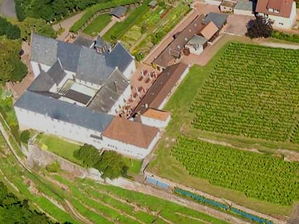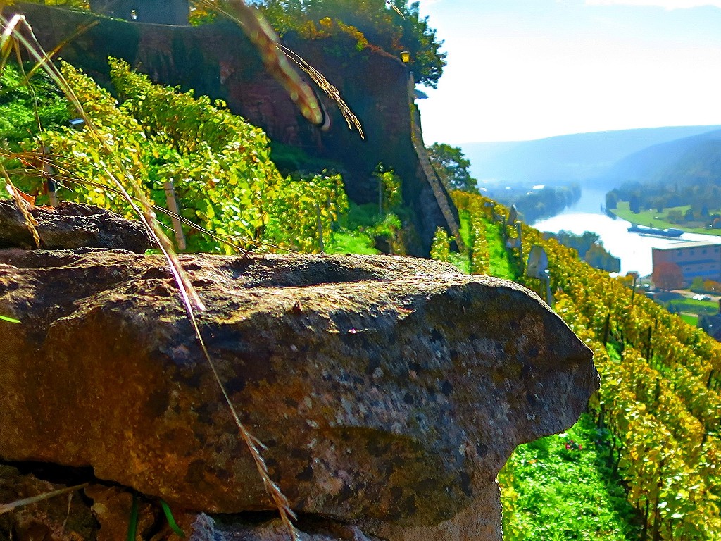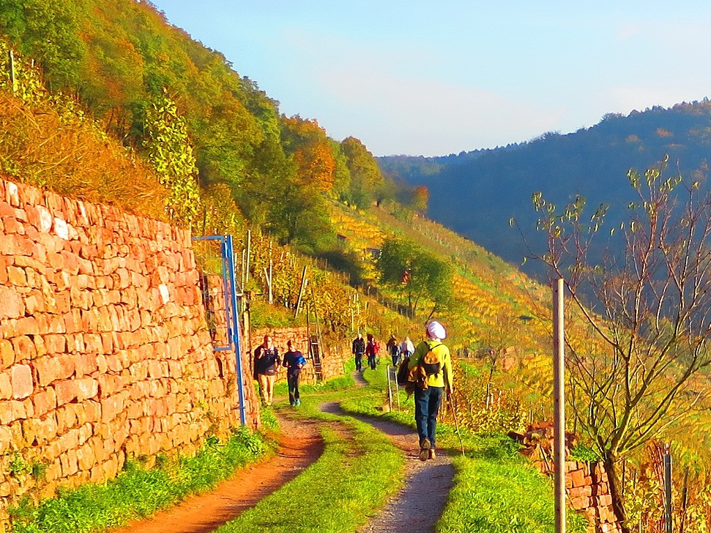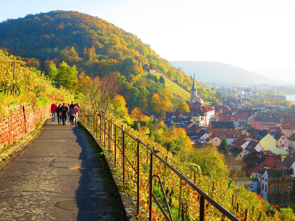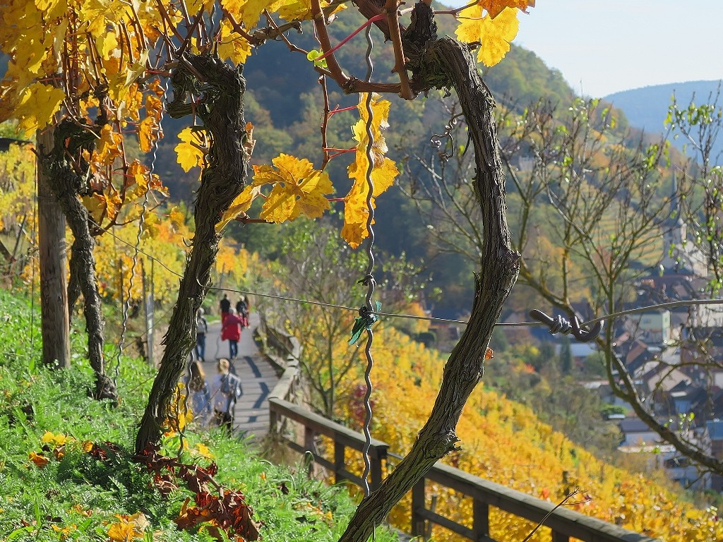 Nachdem wir den Röllbach überquert haben, folgen wir dem Weg bis zu einem Gebäude der Stadtwerke Klingenberg. Hier geht es ein paar Meter nach links und danach direkt wieder nach rechts. An der nächsten Abzweigung wandern wir etwa 40 m nach rechts und folgen dann einem Weg nach links. Wir gelangen an eine weitere Wegverzweigung und wählen die linke Alternative, die uns ein Stück bergauf durch ein Tor in die Weinbergsanlage Restberg führt. Am Ende des Weinbergs betreten wir einen lichten Kiefernwald. Direkt hinter einer Sitzbank aus Holz zweigt auf der rechten Seite ein Waldweg ab, auf dem wir steil bergab laufen. Er mündet im Großheubacher Weinbergsweg, dem wir nach links folgen. Die Straße führt uns nun vorbei an vielen Weinterrassen in Richtung Großheubach. Kurz vor Großheubach passieren wir auf der linken Seite die Danielshöhle. Auf diesem schönen Panoramaweg laden zahlreiche Ruhebänke zum Verweilen ein. Nach etwa 2 km treffen wir auf den Weinberg der Staatlichen Hofkellerei Würzburg. Diese Lage is ca. 4 ha groß und ausschließlich mit Rotweinreben bepflanzt. Wir sehen jetzt auch schon das Kloster Engelberg. Über den Steigeweg erreichen wir den Weinort Großheubach. An der Fasanenallee biegen wir nach rechts ab und gelangen an eine weitere Straße, die ebenfalls zur Fasanenallee gehört.