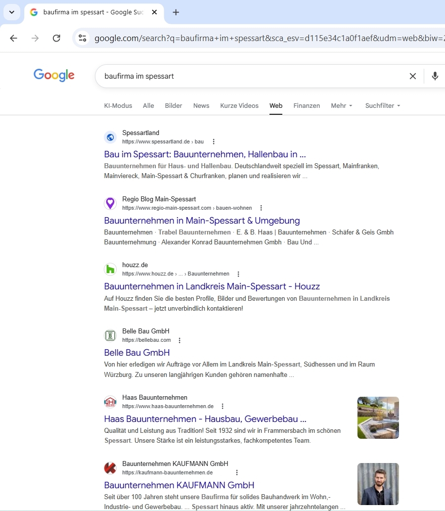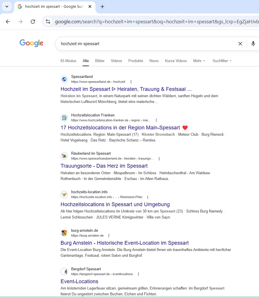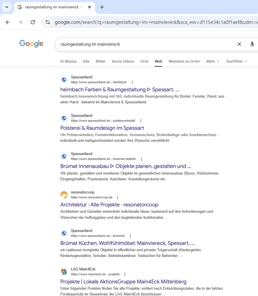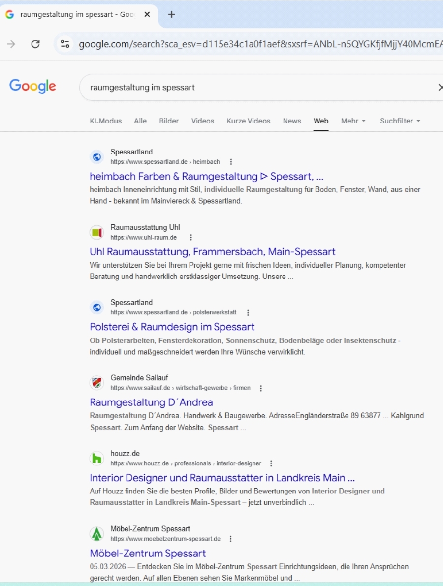 „inneneinrichtung im spessart“ kommt Spessartland ebenfalls auf Seite-1 (Platz 2).